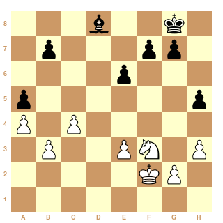 Moi je pense que Bneji a des idees mais manque de tactique :) Je suis entierement sur de me ridiculiser en disant, vu la faussete probable de ma variante a venir: On peut activer l'aile dame rapidement par 1.c5 Fe7 (sinon 2.Cd4 menacant 3.c6) 2.c6 bxc6 3.Cd4 c5 (sinon Cxc6 menace a5) 4.Cc6 (re)gagne a5. Ca foire?