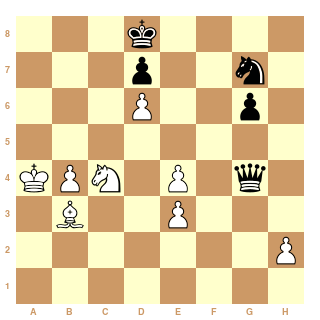 Je voudrais pas jouer les rabat-joies Mais il me semble que j'ai trouvé une faille : 1.De6, e5 2.Dxc4, e6 3.Dc8, h3 4.Ce8, e7 mat Mais aussi... 1.De2, e5 2.Dxc4, e6 3.Dc8, h3 4.Ce8, e7 mat Et encore... 1.Ce8, e5 2.Dxc4, e6 3.Dc8, e7 mat Désolé, mais c'est mat en 3 coups !