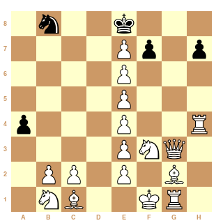 Partie justificative en 20,5 coups (C+).Précisions aux novices : vous devez, partant de la position initiale, aboutir à la position du diagramme après 21 mouvements blancs et 20 mouvements noirs (joués bien sur alternativement). Le sigle C+ signifie simplement qu'un programme informatique (en l'occurence "Euclide") a vérifié que la suite de coups amenant la position voulue est belle et bien unique.