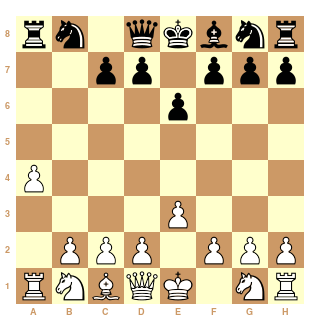 Ca devrait jouer 1.e3 a6 2.Fxa6 b5 3.Fxb5 Fa6 4.Fxa6 Txa6 5.a3 e6 6.a4 Ta8