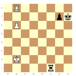 Dla nullité avec le thème de la forteresse. Les sous variantes proposées sont relatives aux coups Noirs. Mais que se passe t-il si les Blancs commencent par 1. Ta8 au lieu de a7 ? 1.b7 [ 1.¦a8!?] 1...¦f7!! [ 1...¦f2+ 2.¢c3 ¦f3+ 3.¢c4 ¦f4+ 4.¢c5 ¦f5+ 5.¢b6 ¦f6+ 6.¢a7 ¦f2 7.¦e8 ¦a2+ 8.¢b6 ¦b2+ 9.¢c6 ¦c2+ 10.¢d5 ¦d2+ 11.¢c4 ¦c2+ 12.¢d3+-] 2.¦h8+!! ¢xh8 3.b8£+ ¢h7 4.£h2+ [ 4.£e8 ¦f6 5.£h5+ ¦h6 6.£f5+ ¢h8 7.£f8+ ¢h7 8.¢c3 ¦f6 9.£c5=] 4...¢g8 5.¢c3 ¦f6 forteresse 6.¢d4 Line