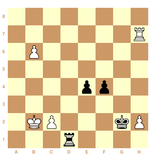 Intéressantes analyses ! Mais je vois toujours pas pourquoi le pion h2 est intouchable : 1.b7 Td8 2.Tg7+ Rxh2 3.c4 f3 4.c5 e3 5.c6 e2 6.Te7 Tb8 7. Rc2 Rg1 8.Te6! f2 9.c7 e1=D 10.Txe1+ fxe1=D 11.cxb8Q et je pense que les noirs s'en sortent avec l'échec perpétuel non ?