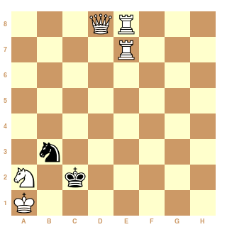 Mat absurde ?! Sur cette position (bien-entendu exagérée !), les blancs perdent au temps. il doit donc y avoir nulle car les noirs n'ont qu'un cavalier. Mais avec un jeu très médiocre (du genre 1... Cf5 2. Cc5 Cd4 3. Ca4 Cc6 4. Cc3 Cd4 5. Ca2 Cb3 #), les noirs peuvent mater bien qu'ils n'aient qu'un cavalier et un roi. Pour l'exemple, la position finale est Alors, les Noirs gagent ou il y a nulle ???