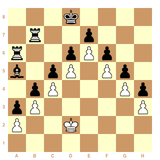 Je rajoute juste un pion noir au diagramme de El cave en a6. Je pense que dans cette position, si les blancs perdent au temps, il y a nulle mais si les noirs parlent au temps, les blancs gagnent. Car avec le jeu le plus médiocre des noirs, ils avanceront le pion h6 et le pion g4 ira à Dame. Qu'en pensez vous ?Les Noirs perdraient avec un pion de plus ??? (et à cause de ce pion !)