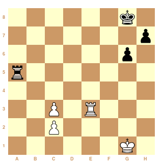Les noirs semblent gagner facilement s'ils ramènenent leur roi vers le pion c. 1.c4 Rf7 2.Tc3 Tg5 3.Rf2 Re6 4.c5 Rd7 -+ 1.Te8 Rf7 2.Tc8 h5 (2...Ta2 3.Tc7 + avec de bonnes chances de nulle) 3.c4 Tg5 4.Rf2 Re6 -+ Maintenant les blancs peuvent toujours espérer une faute des noirs. Par exemple dans la finale après 1.Te8 Rf7 2.Tc8 h5 3.c4 Rf6 avec l'idée de cacher son roi derrière ses pions est nulle. 3...Ta2 est aussi gagnant mais il y aura des subtilités quand les pions noirs seront sur la 4ème rangée : il faut mettre le roi noir en h7 et poussée g3 pour gagner. Aussi 1.c4 Tc5 2.Te4 et la course à la promotion commence avec des chances de nulle grâce au pion c2.