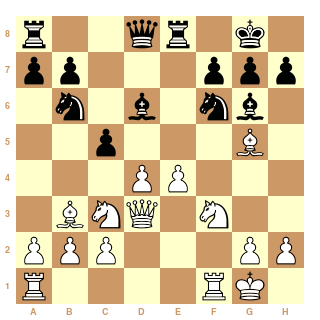 7...Fg4 8.0-0 Cc6 9.Cc3 a6 10.a3 b5 11.Fd3 Dd7 12.h3 Fh5 13.d5 Ce7