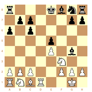 Nbd2 Ne7 9. Re1 Ng6 10. d4 Bd6 11. hxg4 hxg4 12. Nh2 Rxh2 13. Qxg4 Qh4 14. Qxh4 Rxh4 15. Nf3 Rh5 16. dxe5 Nxe5 17. Nxe5 Bxe5 18. c3 ou encore cette autre variante :