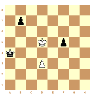 @ LaVagueScelerate Sur 1.d4.b5 2.Rc5.b4 3.d5.b3 4.d6.b2 5.d7.b1=D 6.d8=D les Noirs forcent l'échange des Dames et gagnent avec le pion f qui piaffe dans son couloir.