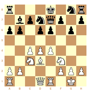 9. Bxe7 Qxe7 10. Re1 g5 11. g3 h5 12. Qd2 f6 13. h4 g4 14. Nh2 O-O-O 15. d5 Ne5