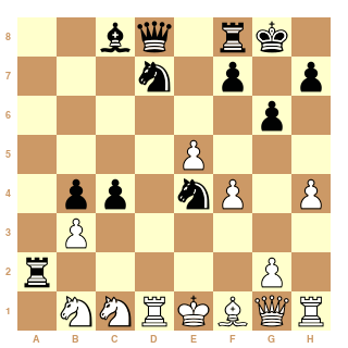 9.Nbd2 0-0 10.Nf1 Qe8 11.Bc2 Kh8 12.Ng3 Bg4 13.d5 Nb8 14.h3 Bc8 15.Nf5 Bd8 16.g4 Ne7