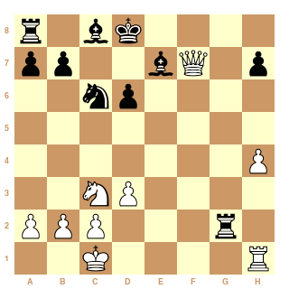 Je continue à penser que les noirs doivent avoir un clair avantage après le 13ème coup, mais en pratique j'ai l'impression que ça s'inverse et que les blancs ont un beau jeu. Ce qui motive cet avis, c'est que je me suis pris une fois la "combi" (que je n'avais pas du tout vu venir !!) avec Fxc7+ Cd5+ gagnant la dame. Je pensais alors réellement m'être fait tactifier, sans me rendre compte que j'avais beaucoup de pièces en échange et que cette position était en réalité archi connue. Cela a peut-être influencé mon état d'esprit dans la suite de la partie, toujours est-il que je m'étais fait détruire (le mec avait pourtant joué Dg4 puis Df4...) et qu'en demandant à Fritz de la jouer à ma place, je voyais bien que je n'aurais jamais pu jouer les mêmes coups que lui.