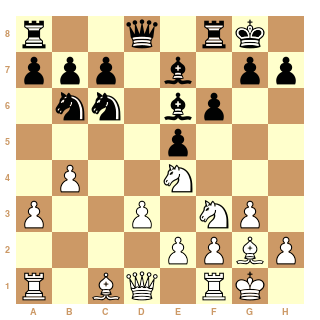 11...De8 presque une nouveauté joué une seule fois dans une partie en 1991 au championnat portugais par correspondance (12.Fb2-a6 13.Tc1-Df7 14.Cc5-Fxc5)
