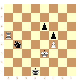 Pour un humain la position est meilleure, certes, mais technique, et surtout dangereuse : une ou deux fourchettes bien placées du cavalier Noir, et le gain s'envole : on doit se contenter de la nulle. Les Noirs sont en mesure de créer des problèmes, car la finale R+T contre R+C a un très fort potentiel annulant.