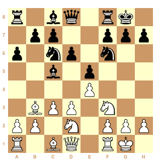 Le diagramme correspond à 1. e4 e5 2. Cf3 Cc6 3. Fc4 Fc5 4. d3 Cf6 5. O-O O-O 6. Cbd2 a6 7. c3 d6 8. Bb3, parce qu'il est impossible de mettre du texte sous le diagramme avec la méthode FEN.