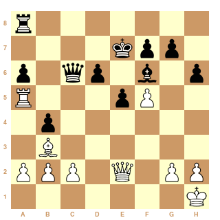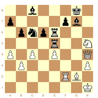 7.De2 a5 8.Fg5 dxe4 9.dxe4 h6 10.Fh4 a4 11.Fc4 Dd6 12.Cbd2 Ch5 13.Fg3 Fg4 14.Fd5 Cxg3 15.hxg3 Ce7 16.Fc4 c6 17.a3 Tad8 18.O-O-O Df6 19.Fa2 b5 20.Th4 Fe6 21.Fxe6 Dxe6 22.Ce1 Cg6 23.Th1 Da2 24. Cc2 Td6