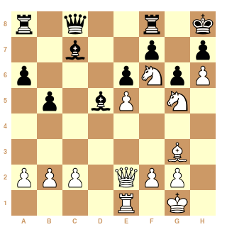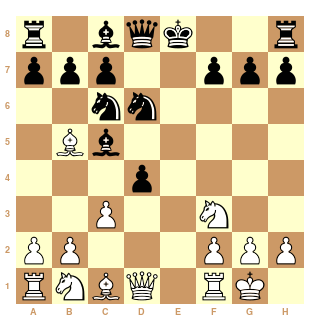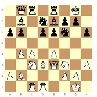 1. e4 c5 2. Cf3 e6 3. d4 cxd4 4. Cxd4 a6 5. Cc3 b5 6. Fd3 Db6 7. Cf3 Cc6 8. O-O Db8 9. Te1 Fd6 10. e5 Fc7 11. Ff4 Cge7 12. De2 Cg6 13. Fg3 Fb7