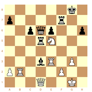 Marie a très bien joué cette partie et je ne vois pas en quoi Dame d6 est plus évident que Tour d5 (facile avec Houdini mais il me semble que renforcer son centre avec Td5 tout en restructurant avec une ouverture de la colonne f qui arrive et pression sur f2 était tout à fait naturel). Malheureusement le jeu sur cases blanches a suffit pour le contre-jeu...
