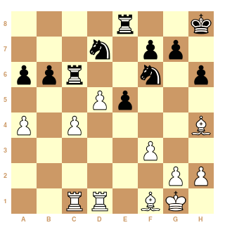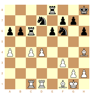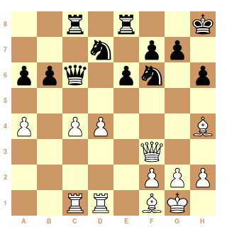 Théoriquement Cavalier et Cavalier est préférable que Fou Cavalier contre Fou Fou ? T'es un mecs incroyable car dans ma bibliothèque dans la maison de famille j'ai jamais lu cela nulle part... merci de m'apprendre la théorie ( j'espère que tu sors pas cela d'un livre de Claude Santoy :-)). Si tu ne joues pas e5 tu souffriras toute la partie...Les blancs sont mieux mais si tu veux je peux te proposer pleins de plans sur tes coups... déjà tu dis que Rh8 est plus utile que a3 alors que c'est faux puisque j'empêche Db4...sur Rh8 Je joue Ff1 avec des idées comme Fg3 puis Db7 . Des fois j'ai des idées à base de c5 lorsque le Fou est en g3 avec l'idée prise en c5 Fa6 puis sur Td8 Fc7