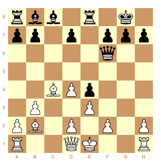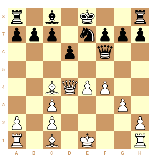 8... h6 9. Bxf6 Qxf6 10. Kh1 g5 11. f4 gxf4 12. gxf4 Qh4 13. f5 Bd7 14. Ng3 O-O-O