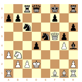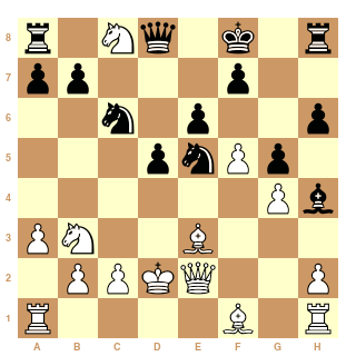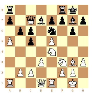 1. e4 c5 2. Nf3 Nc6 3. d4 cxd4 4. Nxd4 Qb6 5. Nb3 Nf6 6. Nc3 e6 7. a3 Be7 8. g4 h6 9. Be3 Qc7 10. f4 d5 11. e5 Nd7 12. Nb5