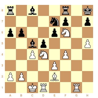 1. e4 e5 2. Nf3 Nc6 3. d4 exd4 4. Nxd4 Bc5 5. Nb3 Bb6 6. Nc3 Nf6 7. Qe2 O-O 8. Bg5 Nd4 9. Qd2 Nxb3 10. axb3 Re8 *