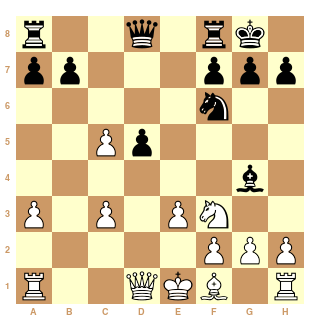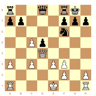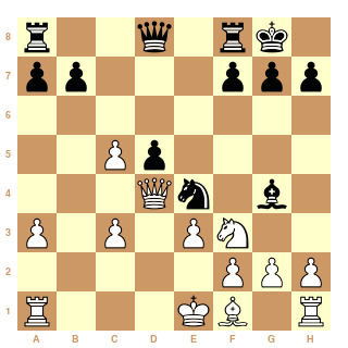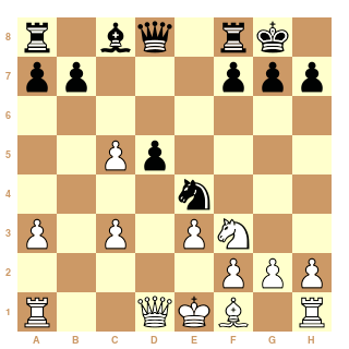 e3 c5 9. c4 cxd4 10. Nxd4 Ne4 11. Bd3 Nd7 12. cxd5 Qa5+ 13. Kf1 Qxd5 14. Qc2