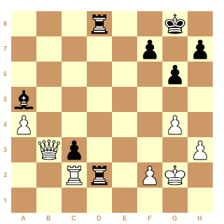 Trait aux Blancs (Parisien 1 - Parisien 2 après 58...Cf7-d6! au lieu de 58...Tg1-f1+?).