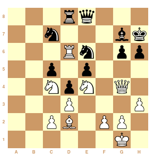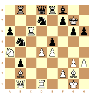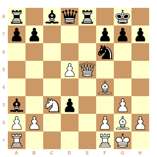 Le coup 13..Fc7 (encore théorique ?) pour ensuite aller en a5 semble curieux, mais on se rend compte que les Blancs ont du mal à consolider le pion d5 en mettant la Dame quelque part pour pousser c4.