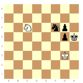En revanche les Noirs au trait sont inefficaces après 1 ..Cd5 2 Ce4! Ce3 3 Cf6+ Rg5 4 Ce4+ Rf5 5 Cf2! paralysant le CN 5...g5 6 Cd3.