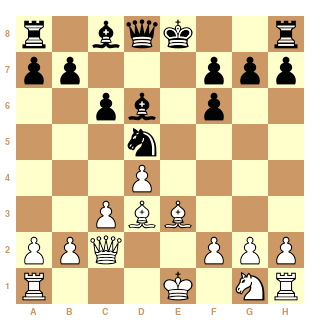 Qb3 Nxc3 9. Bc4 e6 10. bxc3 Na5 11. Bb5+ Bd7 12. Qb2 Bg7 13. Bg5 f6 14. Bf4 O-O