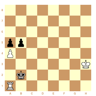 Donc sur un de ces coups, les noirs répondent par leur menace 2...b4! Et si 3.axb alors 3...a3 suivi de 4...a2 (protégé, car la tour est en seconde rangée) et enfin (même si les blancs ont tenté de défendre par Ta6 ou Ta7) viendrait 5...Tb1+ (échec, car le roi blanc, exposé en première rangée, n'aura pas trouvé de refuge préalable, derrière un pion sur la seconde rangée) et a1:Dame (nouvellement protégé par la tour b1.