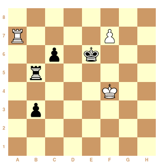 Le gain blanc s'obtient alors par une manoeuvre basique : 1.Tb7xa7 Tb4xb5 2.Ta7-a8 Tb5-a5 3.a6-a7. Et les noirs n'ont plus de défenses contre l'échec de la tour blanche (pour libérer la case a8, avec gain de temps, par exemple Ta8-e8+ suivi de a7-a8:Dame).