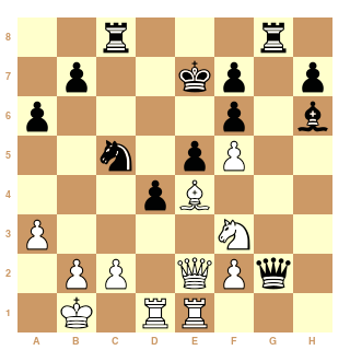 Les parties de Grischuk sont souvent intéressantes à regarder. Dans cette rencontre il y a toute une thématique liée au bon cavalier contre le mauvais fou : Par exemple 23......Cxe4 serait dramatique pour les noirs. Pour obtenir ce type d'avantage stratégique "Sacha" a sacrifié deux pions!