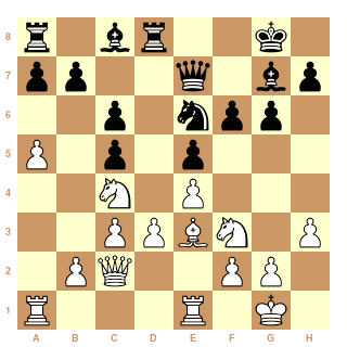 1.e4 c5 2.Nf3 Nc6 3.Bb5 g6 4.0-0 Bg7 5.Re1 e5 6.Bxc6 dxc6 7.a4 Qe7 8.a5 Nf6 9.d3 0-0 10.h3 Ne8 11.Nbd2 Nc7 12.Nc4 f6 13.Be3 Ne6 14.c3 Rd8 15.Qc2 Diagramme