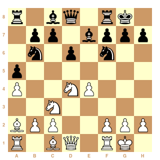 1.e4 d6 2.d4 Cf6 3.Cc3 Cbd7 4.Cf3 e5 5.Fc4 Fe7 6.0-0 0-0 7.Te1 a6 8.a4 b6 9.b3 Fb7 10.Fb2 c6 11.Fd3 g6 12.Dd2 El blanco juego de modo muy standard, pero esto tiene sus peligros. [ Una jugada razonable aquí es 12.Cb1 reciclando el caballo, entendiendo que en c3 se encuentra vulnerable. Véase los análisis a la partida Jones-Sebenik, Liverpool 2008.] 12...Te8 13.Tad1 [ 13.dxe5 Cxe5 14.Cd4 Ff8 15.f4 Fh6= y como mínimo el negro ha igualado, Miton-Khismatullin, Moscow 2010 (0-1 60)] 13...Ff8 [ La opción es 13...Dc7 14.Dh6 ( 14.dxe5 dxe5 15.Ce2 Ff8 16.Cg3 b5 17.axb5 cxb5= Zufic-Predojevic, Zupanja 2009 (½-½ 49)) 14...Ff8 15.Dg5 Fg7 16.dxe5 dxe5 17.Ff1 h6= Schnegg-Juhasz, Fermo 2009 (0-1 32)] 14.Dc1 [ 14.h3 b5! Temática reacción del negro. 15.axb5 axb5 16.Ce2 exd4 17.Cexd4 Fg7= con equilibrio, Timofeev-Bocharov, Plovdiv 2008 (½-½ 49)] 14...Dc7 15.h3?! [ Merecía considerarse la más sólida 15.Da1 b5 16.Cb1 Ch5 17.Cbd2 (King)] 15...b5 16.axb5 cxb5 17.d5 Cc5 18.Da1 Fg7³ El negro ya tiene mejor juego. 19.Fc1? El blanco se equivoca de modo decisivo, pero lo cierto es que el juego negro ya era muy cómodo. [ Debió jugarse algo como 19.b4 ] 19...b4 20.Ca4 Cxd5! 21.Fc4? [ 21.Cxc5 dxc5 22.Fb2 ( 22.exd5 e4) 22...Cf4µ] 21...Cxa4 [ 21...Cxa4 22.Fxd5 Cc3 23.Fxb7 Dxb7 24.Txd6 Cxe4-+] 0-1